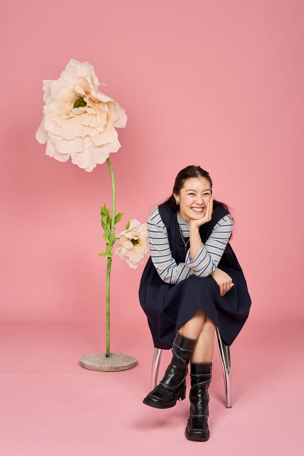 The Petal Dress is a lightly oversized, gathered dress with a dramatic, curved bodice.